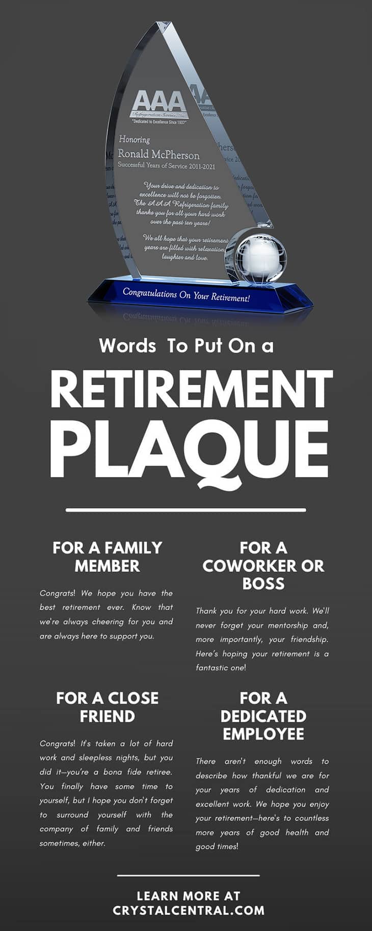 Are you searching for the perfect gift for a retiring family member, friend, coworker, boss, or employee? Crystal Central has retirement plaques in a variety of unique and beautiful styles. Come and design a personalized plaque today!