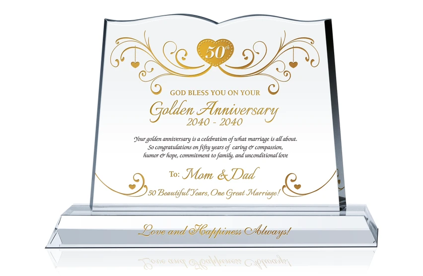 Engraved crystal parent anniversary gifts. Easy to customize, our personalized crystal gifts, awards, and plaques make wonderful keepsakes. We ship worldwide!