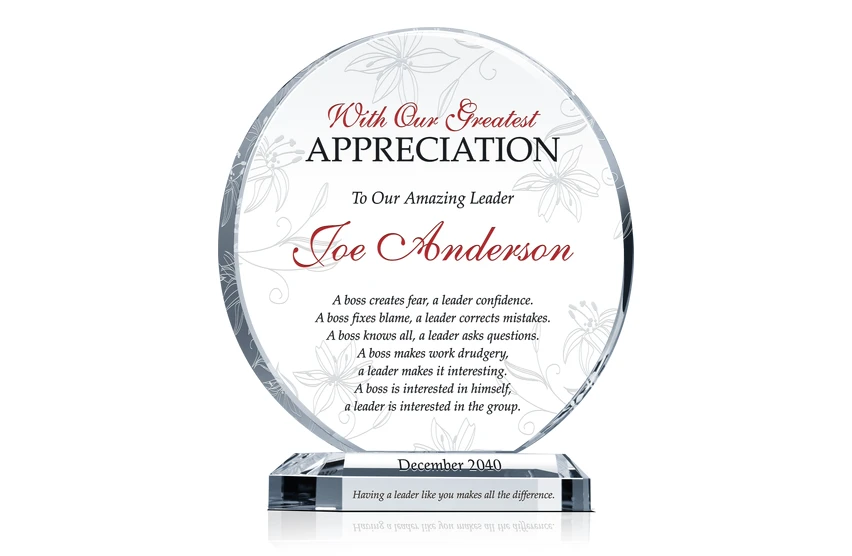 This is the ultimate gift for executive-level appreciation, farewell events, or major leadership transitions. With clean design elements and profound messaging, this award makes a lasting impression.