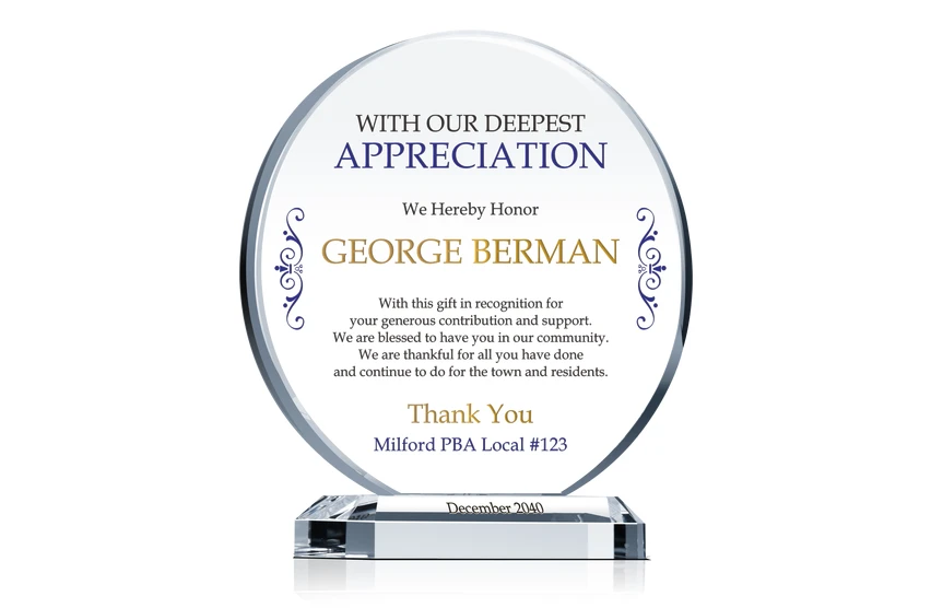 When your are looking for a gift that express your gratitude in a personal way, this crystal circular-shaped appreciation gift plaque is designed with both uniqueness and professionalism in mind. An appreciation gift that will be cherished forever. -