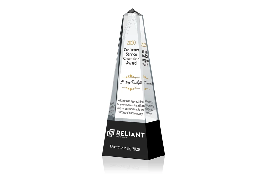 When the time comes to bestow corporate recognition awards, consider something like this gorgeous crystal monument that tapers into a clear peak from a black crystal base. You can customize this piece in honor of any recipient with deep etch engraving and custom color fill. Delight a stand out employees and leaders with a stand out gift.