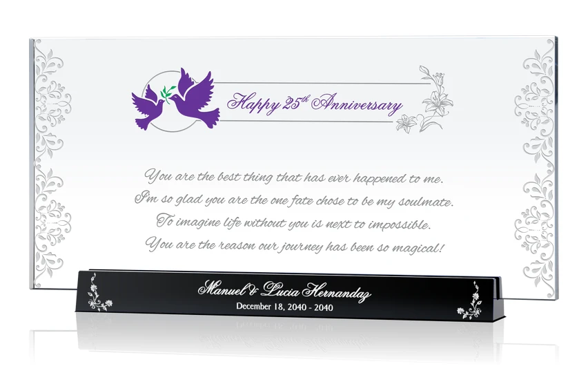 This elegant crystal plaque makes perfect canvas to inscribe words of love, praise and best wishes. This personalized religious 25th wedding anniversary plaque is a timeless keepsake to celebrate a quarter century of marriage designed by God and send your wishes to the special couple or your parents on their silver anniversary date. -