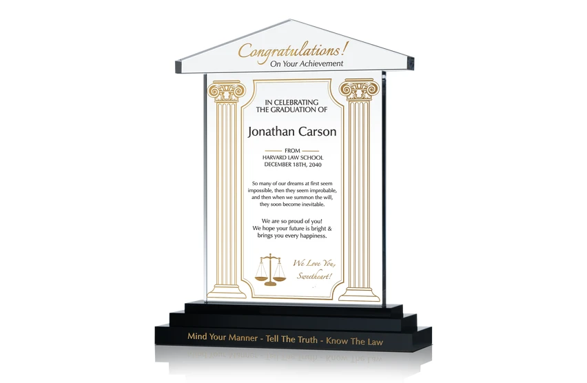 Celebrate your son or daughter's law school graduation with this elegant crystal plaque featuring the lawyer's creed. As your loved one graduates from law school and embark on his or her legal career, this custom lawyer graduation gift is a truly unique keepsake to recognize the law school graduate's hard work and dedication, and a perfect reminder of his or her commitment to law. -