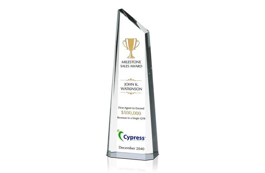 Success in sales is often preceded by rejection, and can be a disheartening experience at times. Creating a competitive environment among your sales people is the perfect way to add a boost to the internal morale and productivity. This Personalized Crystal Milestone Award creates a constant reminder that success is the result of perseverance.