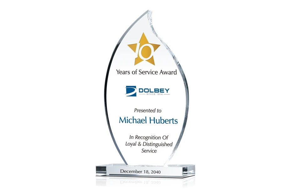 Very pleased with overall ordering experience and timeliness of deliverable. The crystal flame custom engraved award looked beautiful and classy. Definitely recommend!