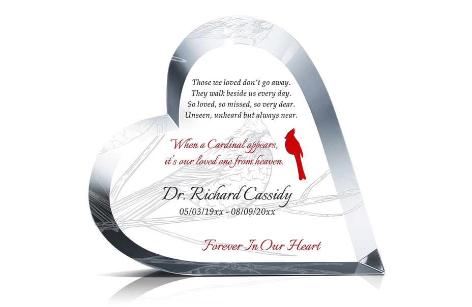 We were very happy with the memorial crystal heart. It was beautifully engraved, and we were able to customize it as a gift for a friend who had recently lost her husband. It arrived a week earlier than quoted. Thank you!