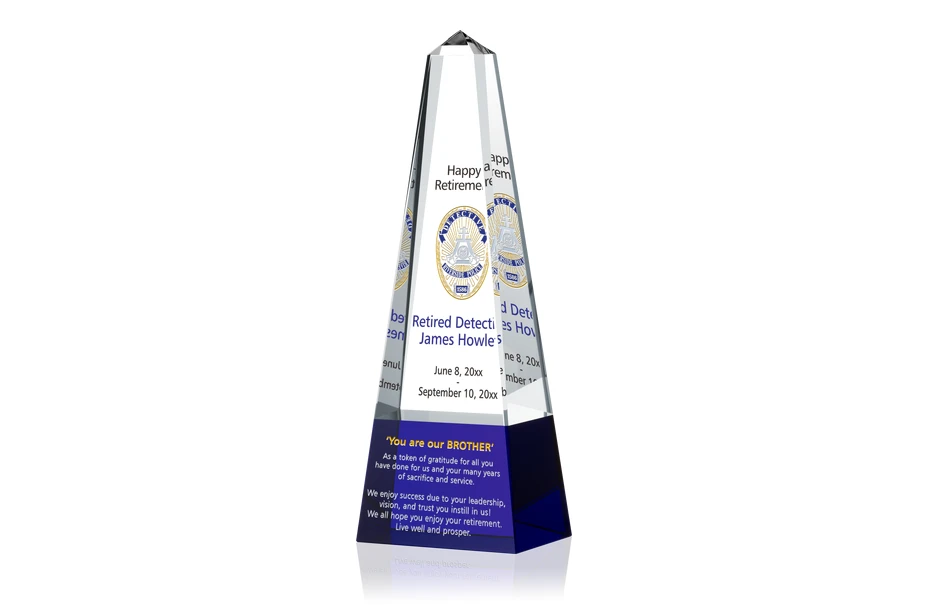 Send off a retiring detective with this meaningful Detective Retirement Crystal Obelisk Gift, personalized with name, dates, badge, and a heartfelt brotherhood message.